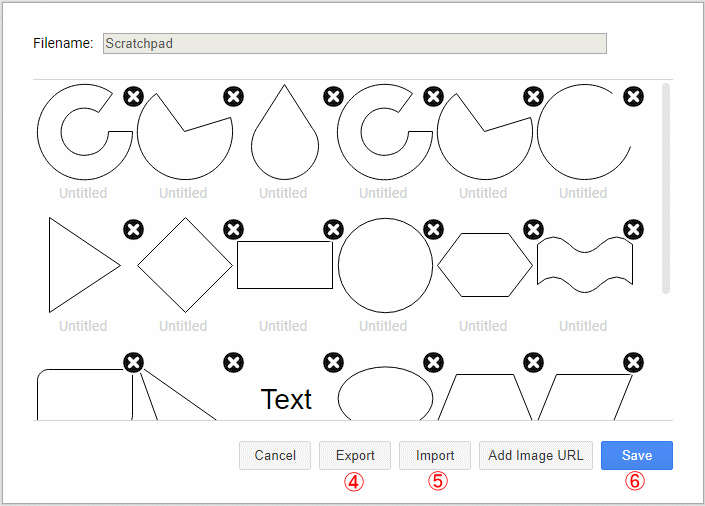 登録したパーツセットは③の編集ボタンを押して開く編集ウインドウ(図ー2)で「Export(④)」すると *.xmlファイルで保存ができる。この *.xmlファイルをクラウドに置けば、別の PCで作業する時にも「Inport(⑤)」して使えるし、作業の種類でいくつかに分けておけば作業毎に変えられて効率的だ。(⑥の「Save」ボタンはそのブラウザでしか使えなさそう。同じIDでログインしても別 PCでは Saveした図形が表示されない。)