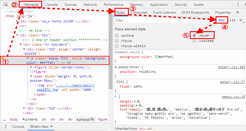 相変わらず狭い話だが、PCブラウザの Chromeで「検証」と言う機能がある。画面を右クリックして表示されるメニューの一番下、あるいはキーボードショートカット「Shift + Ctrl + I」、或いはメニューの「デベロッパーツール」で、画面が分割されてそのページのスタイルシートなどの記述内容のチェックや、それらの値を変更した場合の結果を簡単に確認できる便利なツールで、私も時々お世話になっていた。このツールを使えばブラウザの動作がスタイルシートの記述の意図通りにならないときに、Chromeは実際に HTML/CSSをどのように解釈しているのかがチェックできるのだ。 ただし、静的な状態での確認は問題なかったが、このページの写真などの表示をマウスオーバー(マウスカーソルを載せる)で拡大してポップアップさせるような動的な表示の場合は(当然)マウスカーソルが表示域から出てしまうとその表示が戻ってしまうので単純には見れない・・・・と諦めていた。(無理してcssだけに頼らず、Javaなどの言語を使っても出来るが、CSSだけでこうした動的表示が出来るのが気に入って私は主にこの方法を愛用している) ![]() しかし、このページの写真をマウスオーバーで拡大表示させようとしてハマってしまい、何とかマウスオーバーの状態の CSSを確認したいと Web上の情報を漁った結果、デベロッパーツールで動的な CSSが見れるようになった。その方法は、まず冒頭の方法でデベロッパーツール(検証)を表示させたら、body以下のタグを順次開いて行って ①マウスオーバーのセレクタ部分を選択しておいてから、図のように②「Elements」>③「Styles」>④「hov」とクリックしていって⑤「hover」にチェックを付ける。こうするとブラウザ表示もスタイルシートのプロパティなどもマウスオーバーした状態になって確認できることがわかった。(図の例では class="popup" の要素(縮小した写真領域)にマウスオーバーしたときに、その下の<span> タグの中にある <img >要素(拡大した写真)がポップアップするので、この状態でポップアップ前後のセレクタの値をチェック出来る。cssファイルと htmlファイルの文字コードが違っていたので font-family が文字化けしているが愛嬌!) まだ使い慣れていないので、親要素からの継承などの影響が理解できずに解析に若干時間が掛かるが、何とか意図した通りの写真の拡大表示が出来るようになった。(上または左の写真にマウスカーソルを重ねると写真が拡大表示されるハズ) 今日の写真は毎朝通る道の脇の花壇の花。スカシユリだろうか? 朝見たときは「赤い花だな」くらいにしか思わなかったが、帰り道 暗くなって歩いていたら低い街灯の横からの光を透かして蠱惑的に咲いていた。(撮った写真を見て思った。どこか夜の店でこんな配色のドレスを見たような? >>>はるか昔の話) |