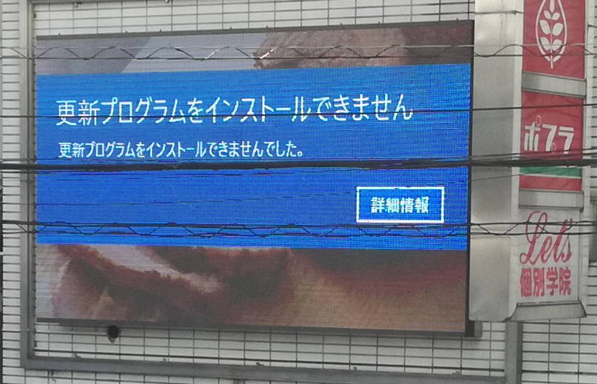 ほぼ毎日小田急から JR町田駅に乗り換えるが、その目の前に動画広告が表示されている。 それが 最近二度ほど、写真のように「Windowsのアップデート失敗メッセージ」が表示されていた。「えっ、こんなシステムで Windows?」と驚いてしまったが、まぁ 高価な専用大画面広告装置ではなくても、ちょっと生かじり程度の知識があれば汎用大型テレビと低価格パソコン(セコハン?)があればできてしまうから、そんな程度の広告なんだろうと想像した。 どうやら半日程度はこのままの画面のようだが、その間の広告費用はどうなっているんだろう? Linuxでも使うか、せめてアップデートを拒否しておけばいいのにと、余分な気を遣わせる広告だ。 | |