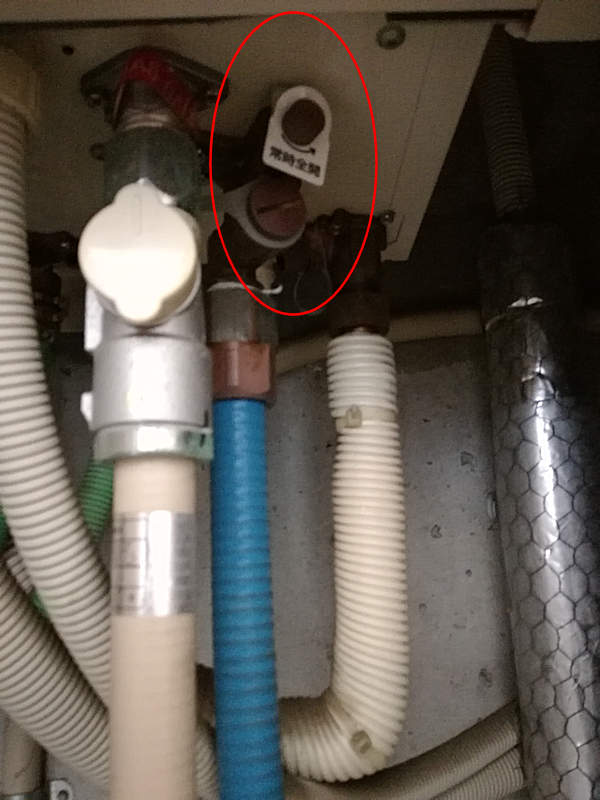 仕方ないので東京ガスのカスタマサービスを呼んで見てもらうと、どうやらこの給湯器の床暖房用ヒーターユニットには循環水の水量調節用の予備タンクがあって、この予備タンクの水がある程度を超えると外に排水するらしい。タンクの水の量を検知して補水調節をする弁があるようだが、これの故障らしいという。とりあえず2枚目の写真のように給湯器の下にあるバルブを閉めると止まることが分かった。
