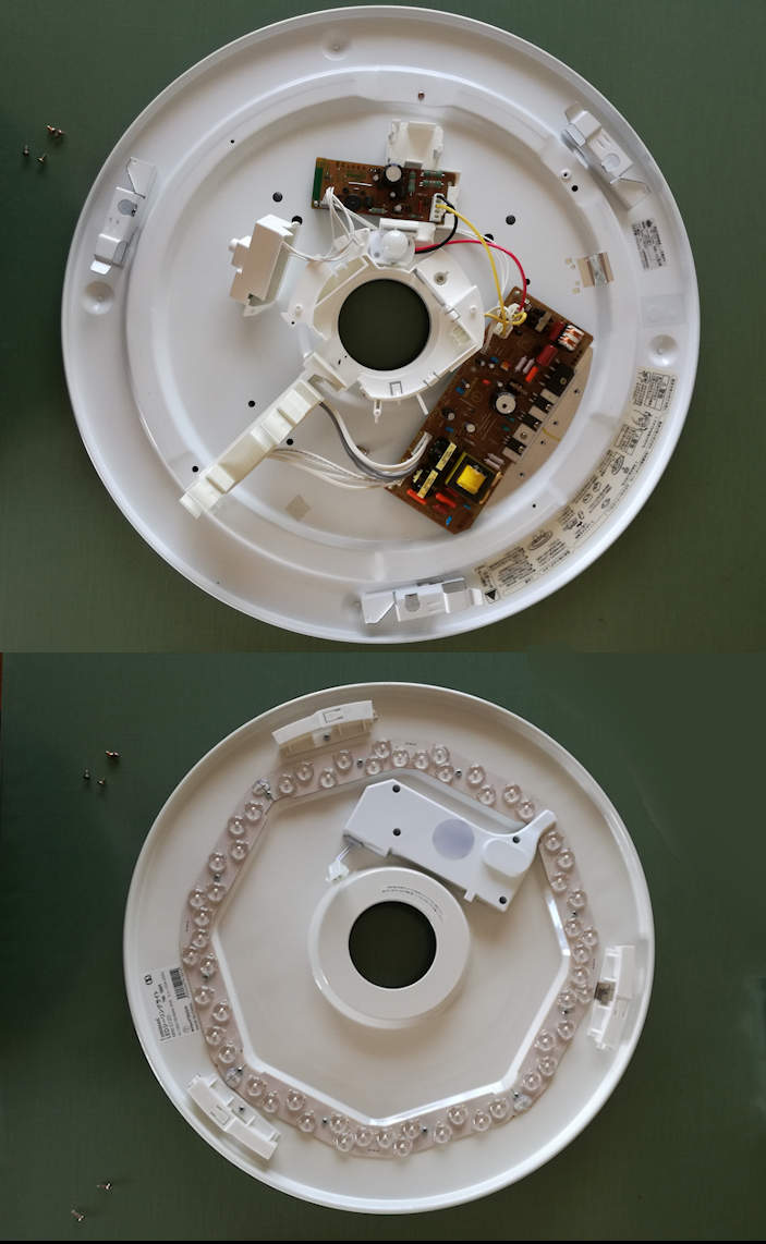 暫く前に事務所を畳んだと書いた。その時事務所で使っていた椅子・机など殆どの什器を処分したんだが、2年弱しか使っていないし自宅の蛍光灯器具と置き換え出来る・・・と思って天井照明器具(LED式)は残しておいた。 先日時間が出来たので(私の時間は余るほどあるが、家人がいない時間は少ない!)早速交換作業に取り掛かった。 自宅の天井照明は 17年前の入居時に取り付けたままの蛍光灯式。リビング以外は点灯時間がさほど多いわけではないので蛍光灯管も交換してない。最近の一般的な天井灯器具はワンタッチで取り付けられるような統一規格化された金具になっているのでそのまま交換するなら5分とかからない。だが唯一にして最大の問題は外観。というのも我が家のリビング以外の 4部屋の天井照明は全て統一した器具でサークライン蛍光灯管式で LED式に比べて 10Cm近く径が大きく外観(白色カバー)に小さな飾りのついたもの。当然そのまま交換したのではこの部屋だけ不統一になってしまうし、さすがの家人も見た目にはうるさいので気づいて「元に戻して」と言い出しかねない。 そこでカバーだけは従来のものを残すことにしたが、新しい器具は大きさもカバーの取り付け方法も異なっているので当然カバーの取り付け部分を含むベースも古い器具のものを残さざるを得ない。安易な期待としては LED式は同じ明るさのものでも発熱が少ない分厚みも径も少ないので何とか古い器具の中に納まるだろうと踏んだ。 実際に古い天井灯器具(右写真-1上)を外して、新しい LED式の器具と比べると LED式の方(右写真-1下)がかなり小ぶりだ。ただ、最初の想定としては古い器具の 蛍光灯点灯回路や 蛍光灯管保持部分を外して、LED基板と回路だけをその空いたスペースに固定できれば・・・と考えていたんだがさすがにそれは甘かった。LED基板は値段相応の非常にチープな薄い基板で取り数(=コスト)の観点から 8分割されておりベースの薄い金属筐体に沢山の爪で固定されており、その形のまま外して古い器具のベースに固定するのはかなり困難だと分かった。但しその金属筐体と LED基板の厚みそのものは足しても非常に薄い。 ちなみに、ラベルから見ると古い方はヤマダ電機ブランドだが部品などから 東芝のOEMらしい。新しい方は ドウシシャ製。蛍光灯式はインバータ方式なのでトランスやコンデンサ、電力半導体素子がバカでかく、電力的(=発熱)にも電圧的にも LED式はかなり低価格で参入障壁が低くなっていると分かる。