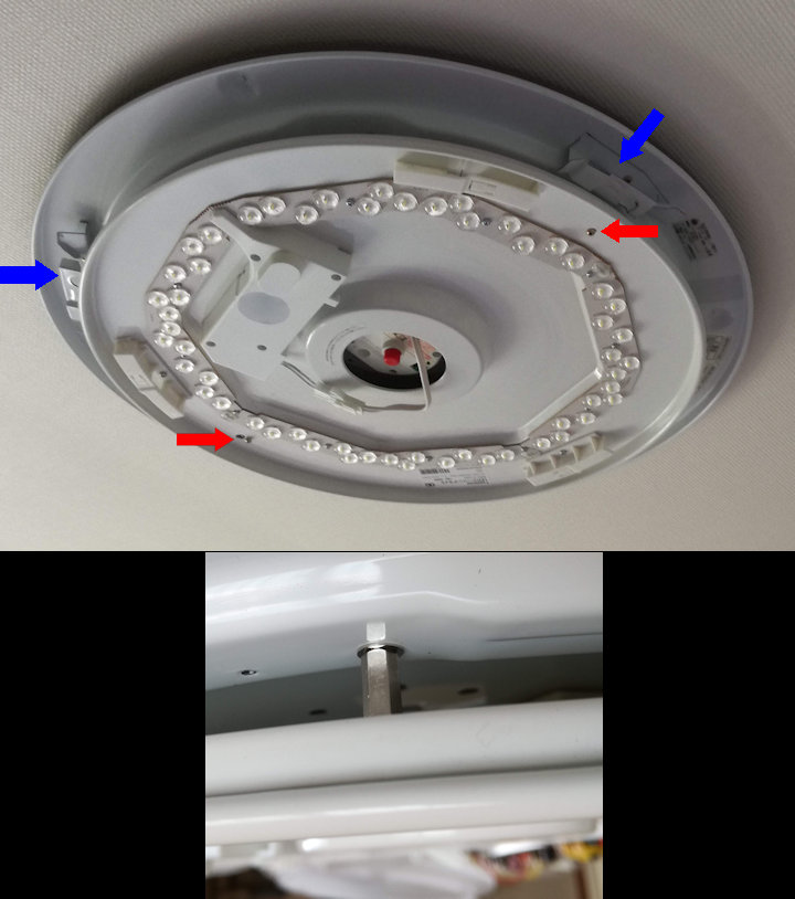 そこで急遽方針変更して、点灯回路と蛍光灯管保持部材を外した古い金属ベースの上に親亀・子亀式に カバーだけ外した LED式の筐体毎スペーサーをかませて載せることにした。この方が点灯回路も固定されたままなのでうまくすればトータルでは工数削減できるかと。 その結果が下の方の写真-2。とにかく廉価な照明器具だから金属ベースも薄い軟鉄で軽いし 穴あけも楽。古い器具(=厚い軟鉄製)の位置決め穴か何かの穴に合わせて、新しい器具の金属ベースに2箇所の穴を開けて(写真の赤矢印)、そこに道具箱を漁って見つけた 15mmほどの金属スペーサーを介して 3mmビスで固定。(写真-2の下の拡大写真) 吊り下げられる格好の LED照明器具は全体でも数百gと軽いから 3mmビス2本でも何とかなる。 古い器具のカバーの取り付け金具部分(青い矢印)も何とか 新しい器具の金属ベース外周ギリギリで隠れることなく固定できた。天井への固定金具は古い器具のベースの丸穴で固定するので LED式器具のベースの丸穴の奥になってしまい、取り付け・取り外しは若干やりづらく本来なら中央の取り付け穴径を拡幅したいが、一度取り付ければ最低 10年は交換も必要ないだろうし目をつぶることに。余録としては、古い器具はリモコン対応ではなかった(開けてみたら受信回路らしきものはあった)が、新しい器具はリモコン付きなのでベッドに寝たままで常夜灯に切り替えられたりタイマーセットが出来て便利。 実際に点灯させてみると、蛍光灯器具のものより色味はかなり短波長側に寄った純白色で、明るさも2倍近く明るく感じる。目を欺くには若干照度を落として使うしか無いかな? | |