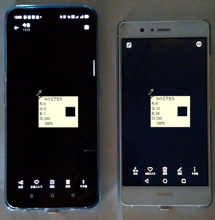 新しいスマホは最近の流れで写真のように従来のものより縦方向に1Cmほど長い。(幅、厚みも若干ずつ増えているが) 更に、画面表示素子は古い方の LCDに比べて OLEDになっているので黒がしまって綺麗だ。右の写真は比較的暗い部屋で従来のスマホと表示を比較するために黒一色(RGB=0:0:0)のJPGファイルを表示させて撮影したもので、見た目にも右のほうが少しグレーがかって見えるが、数値で見えるようにするために画像処理アプリのスポイトツールで黒レベルを確かめたものだが、この図でも自発光素子の OLEDの黒はバックライトを透過する LCDよりもより「黒」に近いことがわかる。 | |