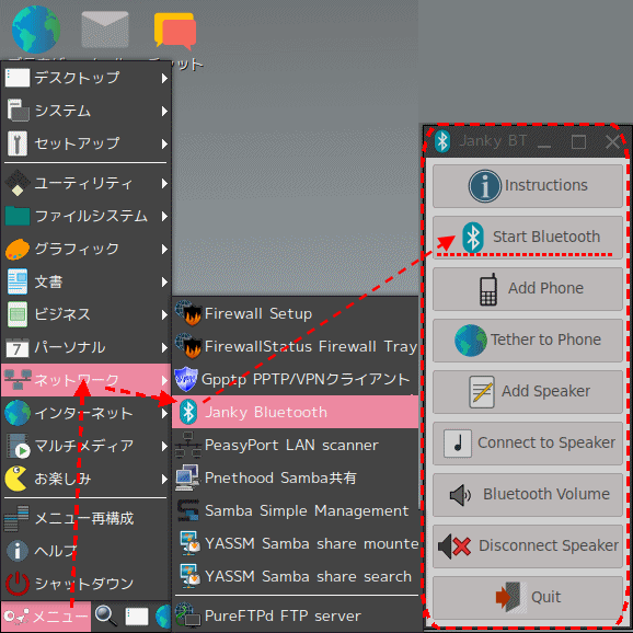 どこかにも書いたが、BIOS改造などをしていると 時々 胡散臭そうな Webからツールをダウンロードしたいことがある。Firewallや Avastなどが入っているのでまぁ大丈夫 とは思っているが、それでも ブラウザの設定が変わってしまったりなどということもある。 そこで、Note PCで USB起動可能な Linuxの軽量ディストリビューションを準備しておいて、そうしたページにアクセスするときはそちらから起動して利用しているんだが、使うのも稀なので 10年近く前のバージョンになってしまい、どうやら最近のバージョンと比べるとかなり低機能らしい。久しぶりに使ってみたら、SSDに慣れたせいか USBから読み込むという事自体がモタモタ感の元凶のような気がしてきた。 ということで、久しぶりに Webで新しい軽量 Linuxの情報を漁った結果 Ubuntsu派生の Fossapup64という超軽量版に決めて USBメモリにインストールしてみることにした。キモは O/S本体だけなら 600KB弱で、起動時にそのすべてを RAMに読み込むので動作が軽快らしい。 Webからインストールファイルをダウンロードしてきて、説明ページの通りインストールしたらスンナリ出来たが、元々疎い Linuxだし以前の Ubuntsuとは日本語環境や操作方法などが全く異なっていて「浦島太郎」状態だ。 そこで忘れてしまいそうなテクをいくつかメモ。 最初は Bluetoothマウスの接続。 まずは メニューから「ネットワーク」>「Junky Bluetooth」をクリックして Junky Bluetoothを起動。 起動した Junky Bluetoothの 「Start Bluetooth」をクリックして「Bluetoothctl」画面を起動。