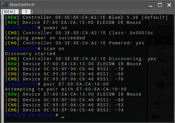 「Bluetoothctl」というターミナル画面が立ち上がるので、[Bluetooth# ]に続けて 「power on」 次に「scan on」と入力。 「Device」に新しい Bluetooth デバイスの Macアドレス[xx:xx:xx:xx:xx:xx]が表示されるのでそれをコピーして、[Bluetooth# ]に続けて「Pair [xx:xx:xx:xx:xx:xx]」を入力し、前後してマウスのペアリングボタンを押す。 すると「Attempting pair with xx:xx:xx:xx:xx:xx」の後暫くして「Pairing successful」と表示されてペアリングが完了する。 続けて「connect [xx:xx:xx:xx:xx:xx]」と入力してターゲットのマウスを接続すると、Bluetoothマウスが接続されてマウスでカーソルが動くようになる。 ただ問題は、Windowsのように一回シャットダウンした後に再起動で自動で接続することは無いようで、再び Junky Bluetooth を起動してターミナルから Power onを実行するなどの操作が必要になる。また Windowsと相互で利用しようとするとマウス内のペアリングのキーが書き換わるらしく反対のO/Sに戻したとき繋がらなくなって Windows/Fossapup双方でペアリングからやり直さないといけないみたいだ。 | |