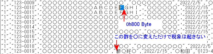 0h800 番地の文字コードだけが問題だとかではなく、離れた場所の文字を変化させても現象が起きたり起きなかったりで、掴みどころがない。当然今までずっと問題は起きなかったということで、Shift_JISでもほとんどのファイルでは現象が起きない。