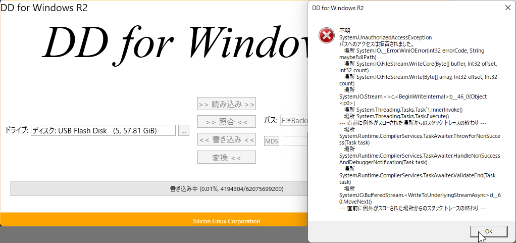 一方 DD for Windowsの方は Linuxの DDコマンドを Windows上で実行できるようにしたもので、最新バージョン R2を Windows11上で実行したところ、バックアップは問題なく出来たが、復元しようとするとエラーが出て使えなかった。仕方なく 古いバージョン(0.9.9.8)をダウンロードして試すと(Xp互換モードを設定する必要があるが) R2で保存したバックアップデータのままでも復元できた。(と思ったら何故か2度めは装着した USBメモリが表示されなかった)こちらはバックアップデータの圧縮は出来ないと思われる。 >>