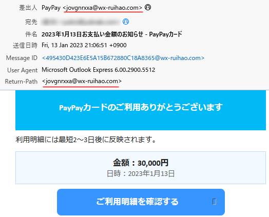 今回のスパムは図のような PayPayカードの利用情報メール。私は PayPay支払いは利用しているが PayPayカードは利用していないし、PayPayでは利用時に即スマホ端末に「ペイペイ」という音声情報とともに PayPayアプリの「PayPay STEP」>「取引履歴を確認する」で確認できるが、メール通知は届かない(設定によっては来るかもしれないが私は届かない)。しかも私の場合「後払い」や「オートチャージ」ではなくて通常は1万円以下の残額で、支払う直前に支払額に若干プラスしたキリのいい金額をチャージしているだけので、メールに表示された「30,000円」なんて引き落とせることはない。メールアドレスのドメイン名(@よりも後ろの文字列)も PayPayとは関係ない怪しげな名前。
