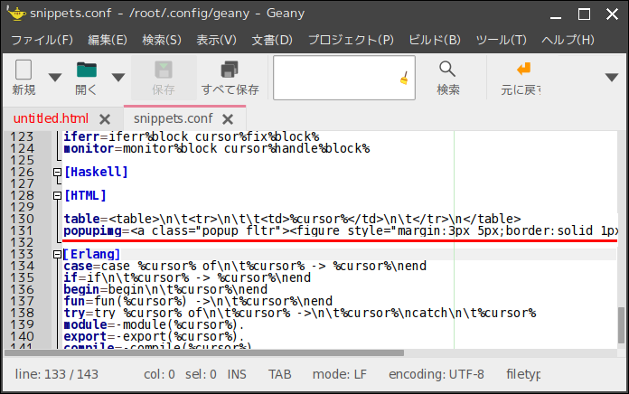 popupimg= <a class="popup fltr"> <figure style="margin:3px 5px;border:solid 1px #aaa;"> <img src="%cursol%" class="image" style="width:100%;max-width:300px;"> <figcaption style="margin-top:-10px;text-align:center;font-weight:bold;"> 図 </figcaption> </figure> <span style="right:10px;bottom:30px;"> <img src="" > </span> </a>のような行を追記しておいて HTML文の定型句挿入箇所で 「popupimg」に続けて「Tab」キーを押せば登録した定型句が挿入される。「%cursol%」は定型句挿入後のカーソルが表示される位置、「\n」は改行「\t」はタブキー(インデント)らしい(注意:\はLinux上ではバックスラッシュで表示される)。