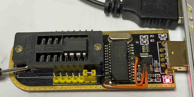 ただし、このページなどでメインマシンの ASRockのマザボの不調を かなり強引に BIOS編集して書き換えた時、BIOSチップの SPIライターを購入してあったのを思い出してそれを探し出した。サブのマシンはかなり古いので、BIOSチップは 8Pin DIPソケットに刺さっている。そこでこれを引き抜いて唯一残っている Note PCで作業。