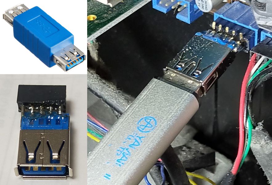 帰ってさっそく久しぶりに楽しい工作。メスコネクタ同士の間をつないでいるプラスチック部分は軟質プラスチックで削ぐと簡単に端子部分が露出した。端子のハンダを溶かして配線を切り離して、部品箱から 10Pinのコネクタを探し出して端子部分を向かい合わせて見ると双方が 2.54mmピッチなのでハンダで直付け出来た。接続を確認してエポキシ接着剤を盛って補強して完成(写真左下)。マザボ側コネクタは USB2.0 x 2 だがハンダ工作の都合上片側だけを使用。