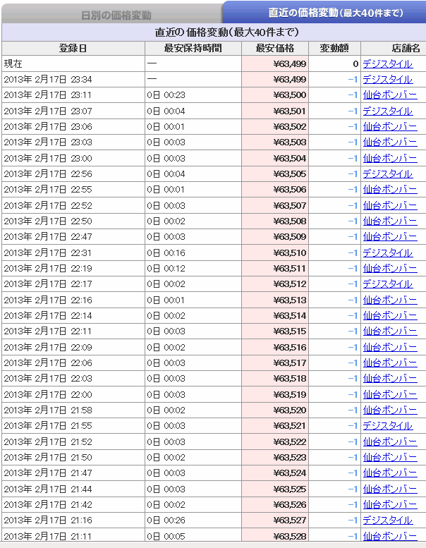 寒いせいでウメの開花が遅いと書いたが、今日はまた一本咲きはじめた木を見つけた。これも民家の塀の中で家人がいた関係で写真は撮らなかった。遅いながらもこうして徐々に一本ずつ咲いていくんだろう。 今日の朝日新聞の天声人語には「探梅」はこの時期に相応しいが俳句の季語としては冬で、節分までしか使えないと書かれていた。今使うなら「観梅」としないといけないらしいが、俳人とは何とまぁ一人よがりで不自由な人たちかと思ってしまう。17文字の組み合わせしかない「作品」ではそんな理不尽な作法で雁字がらめにしないと権威づけできないということだろうか。 さて、そんなことはどうでもいいが、昨日の続きで 価格.comの価格推移に注目したら 商品の購入よりも価格推移の現象が面白くなってしまって、ついついそのページを更新しながら見入ってしまう。 どうやら、2~3店舗が 数分間隔で 1円ずつ下げているらしい。価格推移のページを探したら、直近の最低価格を出した店と時間、その価格が表示されるタブがあった。どうやら「*ボンバー」という店はロボットで約 3分おきに 1円ずつ下げるような操作をしており、その他の店は不定期にそれを下回る額を時々入れているのでコチラは人為的に入力しているのではないか、そして夜中の 11時過ぎには「*ボンバー」がロボットを止めて、その後 一定時間してから別の店がそれを潜る価格を提示しておいてこの競争が一旦「休戦」に入るらしい、そして再び翌朝 9時前後に再開する・・・・等など舞台裏を想像できて買い物よりもむしろ楽しい。まとめ発注した商品を、なるべく利幅を稼ぎながらも売り残さないような駆け引きが目の前で展開されている。生鮮食品のセリや証券売買の様相だ。価格.com もその辺りの売り手側、買い手側の心理をついた仕掛けで漁夫の利を稼いでいる訳で、ここが一番ずる賢い。 価格差といってもトップから数店は数円しか違わないが、やっぱり1番目に表示されると目立つからクリックされる=注文に結びつく確率が高いんだろうなぁ。故障時の保証内容など、千円以下の違いだったらもっと吟味する項目もあるような気がするが、所詮地震と一緒で、運不運のほうが大きいから起きる前に考えても仕方ないと思っているんだろうか。 お目当ての機種は、この数日間値下がりが激しくなってきており、毎日 400円程度下落しているようだ。意中の店の在庫の最後をどうやって見極めるか、結構スリルがある。 |