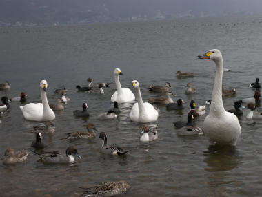 今日は諏訪湖で白鳥を撮影。昔は諏訪湖には白鳥なんていなかったような気がするが、最近は随分とたくさんの白鳥が飛来するとか。今年も、もう既にかなりの数の白鳥が北に帰ったらしいが、岡谷側の湖畔には数十羽の白鳥がカモなどと一緒にエサをついばんでいた。カラスや鳩などの鳥は他の鳥を追い払う習性があるが、水鳥は平和主義なのか白鳥もカモもエサが撒かれても、喧嘩せずにつつき合っていた。