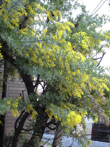2~3日前に、気象庁が桜の開花宣言をしたのを聞いて「えっ! もう」と思った。 しかし、この辺りでも今朝はソメイヨシノの枝にチラホラ花がつきはじめた。何と、勝手に今年は寒かったし、ウメの開花も遅れたようだから桜も平年より遅いのでは、と思っていたのに、関東では観測史上最速だとか。駆け足どころか短距離走並だ。 まぁ、今日も大和まで自転車で出かけたが、2週間前にはダウンのコートでもいいかな?と思っていたのに、今日は薄手のセーターで十分なくらいの暑さだったから、この1週間ほどの気温からすれば開花しても当然なんだろうけど。 なんて話をしておきながら、今日の写真は桜じゃなくて恐縮だが、フサアカシアという木らしい。数日前にアップした銀葉アカシアと似ているが、どちらも花は黄色ながら、銀葉アカシアのほうが直径 2cmくらいもある大きな丸い球状で、フサアカシアの方は 1cmも無いくらいの小さなフサの集合のような感じ。葉は銀葉アカシアは硬くて短く、フサアカシアの葉は柔らかいらしい。 |
