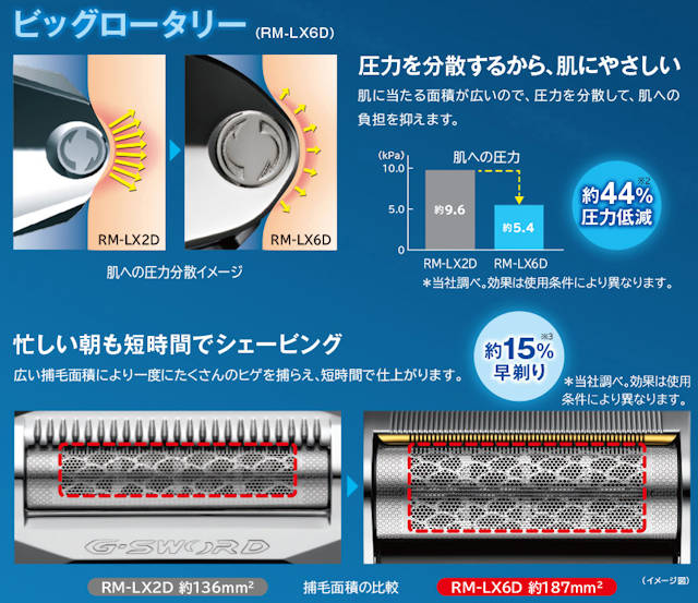 しかも半径が大きくなって肌に接する面積が増えれば一度にヒゲを捉える網刃の穴の数も増えるから往復動作回数も減らせて早剃りが可能になる(ハズ!)。