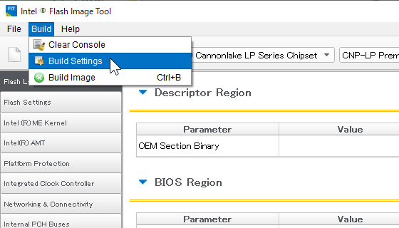 ここまでの作業で FITツールの実行ファイルフォルダーに使用したBIOSファイル名のフォルダーが生成されて、更にその中の「Decomp」サブフォルダー(私の場合は \Flash Image Tool\WIN32\b360m_10\Decomp )に「BIOS Region.bin」、「CSE Region.bin」、「Desctipter Region.bin」、「OemBinary.bin」など、多数のファイル(BIOSリージョン、フラッシュ記述子、OEMリージョンなど)が生成されている。