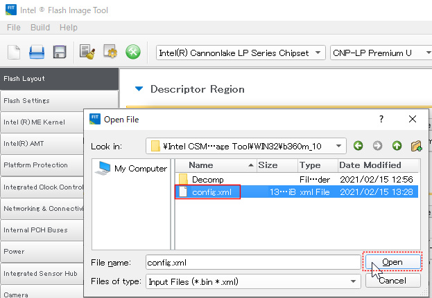 ( FITツールは 4.の中でロードしたダンプ BIOSを解析し、各領域中の構成ファイルや Dataの Offsetや Sizeなどの構成情報を 「Config.xml」ファイルに記録するとともに、各構成要素を「Decomp」フォルダーに OemBinary.bin / BIOS Region.bin / EcRegionPointer.bin などとして抽出・保存する。 CSMEリージョン中の各構成ファイルと ダウンロードした 「Intel CSME 12.0 Firmware Repository r25」中からリネーム&コピーした「MESubPartition.bin」ファイルを読み込んだ「config.xml」に基づいてクリーンアップした BIOSを再構成しているものと思われる。)
