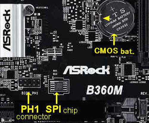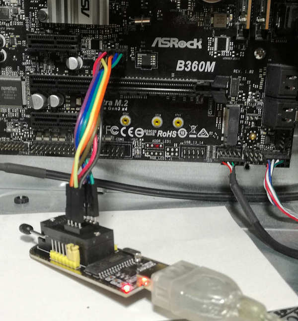 しかし 上記の B360M-HDV と言うマザボの写真を見ると、BIOSチップの近傍に 何やら BIOS_PH1と印刷された 10Pin程度のピンヘッダーがある。もしや?と思って検索すると、少なくとも ASUSのマザボにはサービス対応用に シリアルラインが Pin接続出来て、そこに SPI Writerと言う EPROMの読み書きツールを繋げば BIOSの読み書きが出来ると分かった。