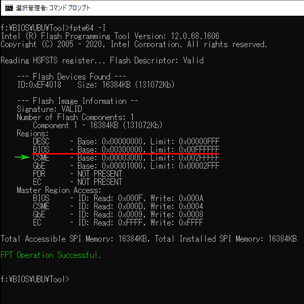 同じ FPTW64に -I パラメータをつけて実行したのが 図-9で、この図から書き換えられたのは赤下線の BIOS領域( 300000 ー FFFFFF の 13312KB)だとわかる。