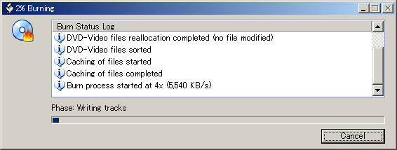 以上で書込みが開始され、x4速のディスクなら 10-20分ほどで完了するが、書込みが終わったら念のためにDVDプレーヤーなどで再生できるか確認してみる。よく人からもらったDVDディスクが再生できないという声を聞くが、せっかく苦労して上げても再生できないディスクではゴミが増えるだけで、もらった方も(自分の操作が悪かったのかとか考えてしまい)「見えなかった」とは言いづらいので気をつけたほうがいい。