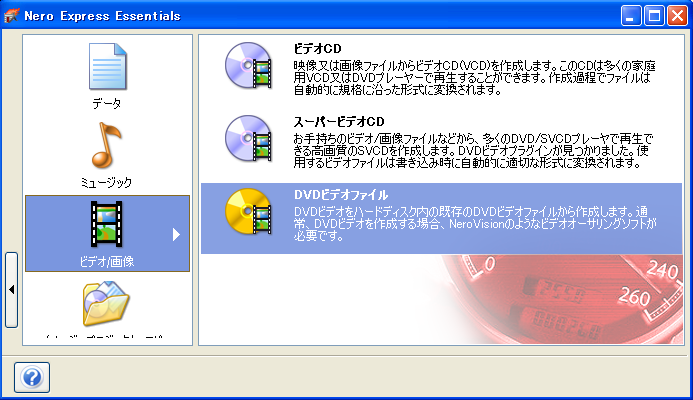 下図のような作業選択画面で <ビデオ画像> >> <DVD ビデオファイル>を選択する。