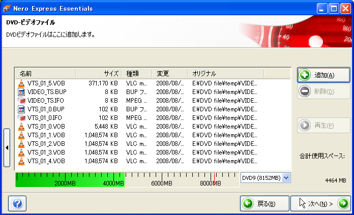 そこで、一旦できあがった生成ファイルをDVD焼き込みソフトの Neroで DVDビデオディスクモードで焼き込めないか試してみた。どうやら、DVDレコーダーで再生できたので問題ないようだ。しかも、こちらでは同じ Imationのディスクでもエラーは今のところ起きていない(n=3)。以下はその手順。