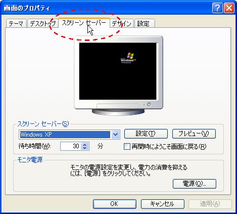 【コントロールパネル】 >> 【画面】から【スクリーンセーバー】タブを開きます。