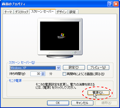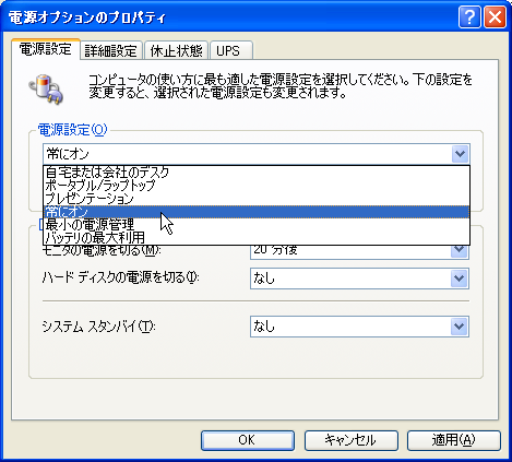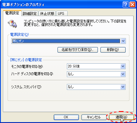 【ハードディスクの電源を切る】と【システムスタンバイ】が【なし】になっていることを確認して、【適用】ボタンを押します。