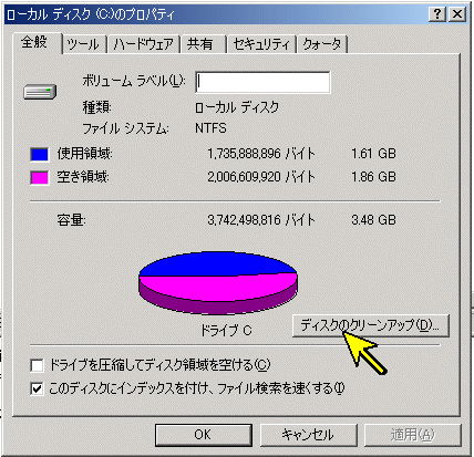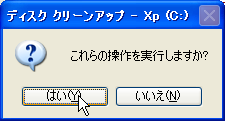 【マイコンピュータ】を開いて、【Cドライブ】の上で右クリックして、【プロパティ】を選択し、【ディスクのクリーンアップ】ボタンを押します。