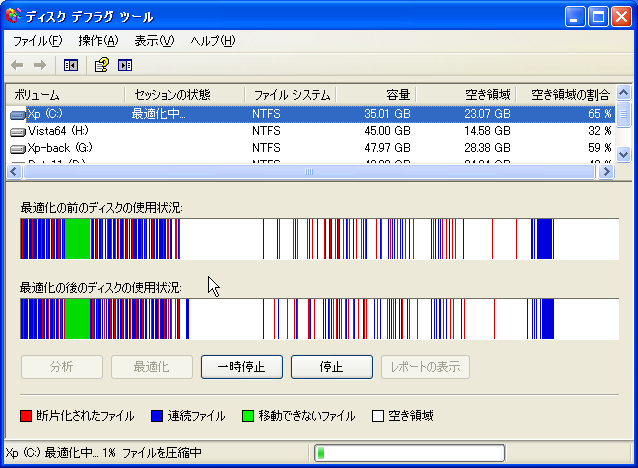 【最適化中】表示が出て最適化が実行されます。時間はドライブの種類・サイズや断片化の割合によって変わりますが、30分以上かかると思っておいた方がいいでしょう。