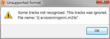 ただし、tsや m2ts形式の動画ファイルはかなり規格が複雑で、扱うアプリによって解釈が違うらしく他の形式に比べるとエラーを起こすことが多い。国内メーカー製ハイビジョンカムコーダー等から直接ダウンロードしたファイルなら多分問題ないんだろうけれど、Webからダウンロードしたり デジタル放送をダビングした BDディスクからリッピングしたり、PCアプリで編集したりしたファイルの場合、エラーが出ないことのほうが珍しい。こうしたファイルを tsMuxerに読み込ませると例えば下のようなエラーが表示されることがある。