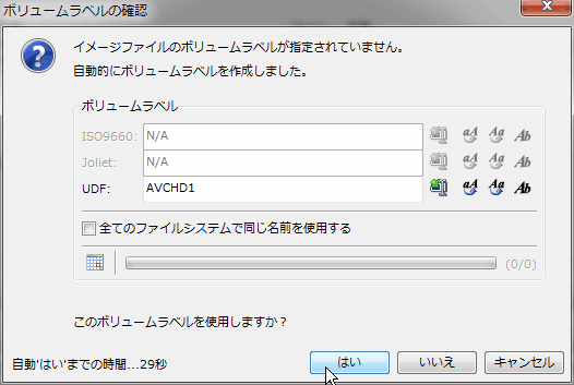 BDディスクにムービー内容などに関連したボリュームラベル(ディスク名)を付ける場合はここで設定するが通常はそのままで「はい」をクリックする。
