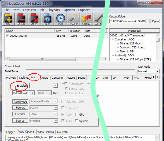 Mediacoderで、この「本編 2」のファイルを読み込み、Audioタブで Formatを 「AC3」に設定し、