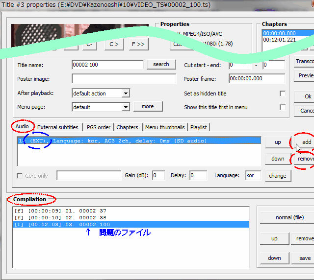 Propatiesウインドウを開いて一番下の「Compilation」欄で「本編 2」に対応するファイルを選択し青く反転した状態で、その上の「Audio」タブで初期状態で表示される音声トラックを選択した状態で「remove」ボタンで削除してから、次に「add」ボタンを押して上記手順で作成された *.AC3ファイルを指定して読み込ませる。外部ファイルが読み込まれると音声トラック情報の頭に(EXT)という文字が表示される。こうすることで「本編 2」ファイル中のビデオトラックだけが使用され、音声トラックは 新規に作成した音声ファイルが使用出来る。