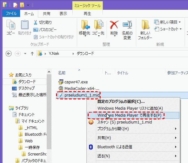 Explorer を起動して、保存しておいた *.mid ファイル上で右クリックして、