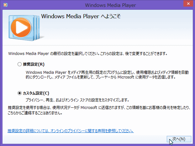 「Windows Media Player へようこそ」というウインドウが開く。「カスタム設定」を選択。