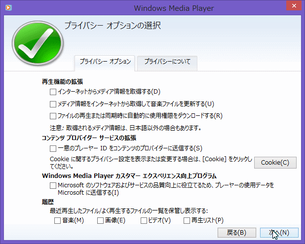 「プライバシー オプションの選択」では何もチェックを入れる必要はないが、メディア情報などを表示したければチェックを入れても可。