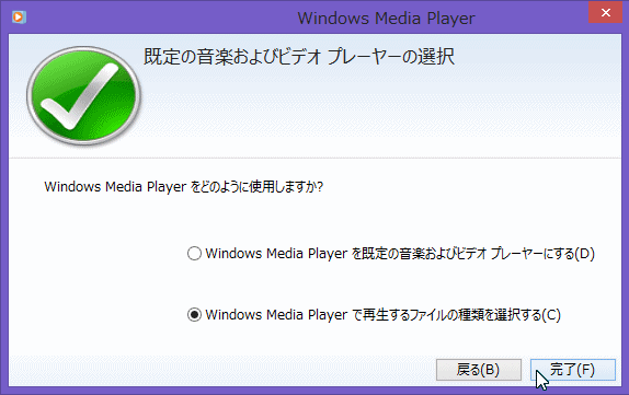 「既定の音楽およびビデオプレーヤーの選択」では、「Windows Media Playerで再生するファイルの種類を選択」をチェック。
