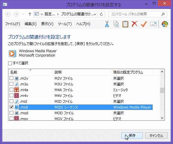 「プログラムの関連付け」ウインドウが開くので、下の方にスクロールして「.midi」の項目が 「Windows Media Player」になっていることを確認する。