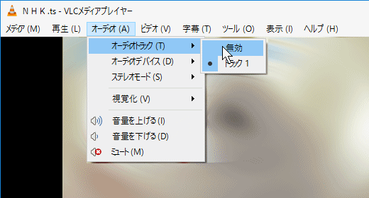 【3】VLCメディアプレーヤで再生開始後、一旦オーディをを「無効」にした後、再度元のオーディオトラックを指定し直す。