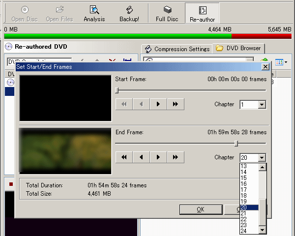 その時、指定した後に「Total Duration」に再生時間、「Total Size」に容量が表示されるので、この容量を1枚のDVDに収まるようにチャプターを選ぶ。
