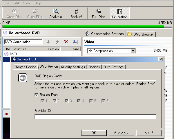 デフォルトで「Region」は 「Region Free」となっているが、「DVD Region」タブで確認する。