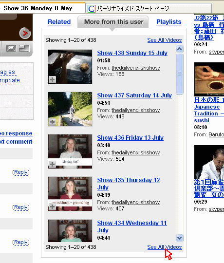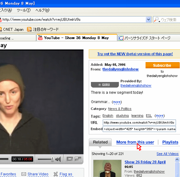 COWON D2を買って、コンテンツを探しているうちに、YouTube 上にニュージーランドから来日して、北海道の倶知安で英語教師をしていると自己紹介のある女性が、何と 400回以上も英語の教育番組を流しているのを見つけました。YouTubeですから基本的に視聴はタダですし、いろいろと問題が取りざたされている動画投稿サイトにあって、多分これらの動画は合法的で非常に有用な情報だと思います。