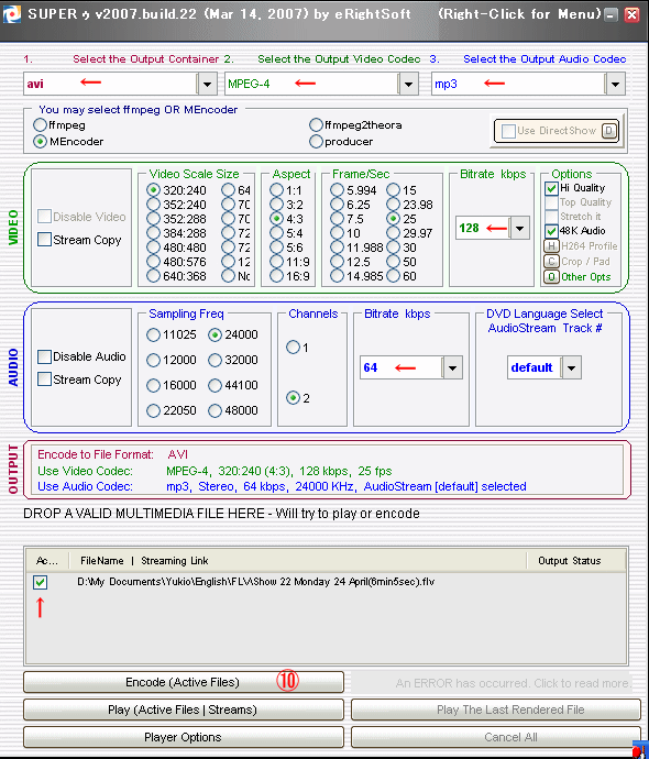 ⑦ 項目を確認して、問題なければ Encodeボタンを押す。(⑩)