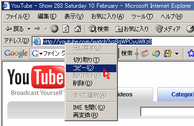 まず、YouTube などの動画サイトで動画を再生しているときに、Internet Explorer の URL欄に表示される URL(http://www. ・・・という文字列)をコピーする。コピーの方法は、URLの上で左クリックするとURL全体が青く選択されるので、その状態で今度は右クリックして表示されるプルダウンメニューからコピーを選択する。