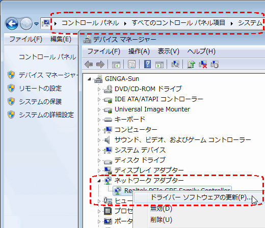 これでも問題が解決しない場合は、上記設定は元に戻しておいた方がいい。( -1- 項の 「デバイスドライバーの削除」を行っても DHCPに再設定される。)