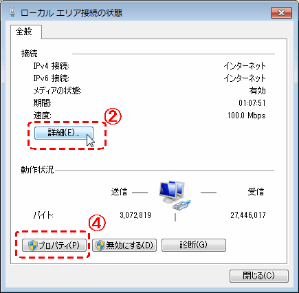 「ローカルエリア接続の状態」で「詳細」ボタン ②をクリックする。
