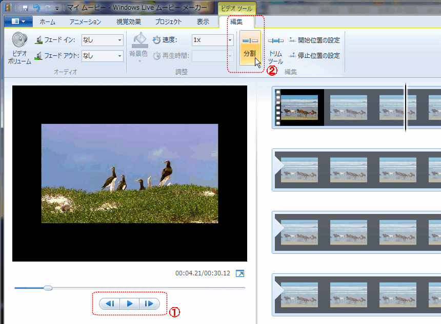 まず挿入した動画の視覚効果を入れる最初の部分で再生を一旦止めて、コマ送り/戻しボタンで分割部分の微調整を行なって(①)から、編集タブの「分割」ボタンを押す(②)。