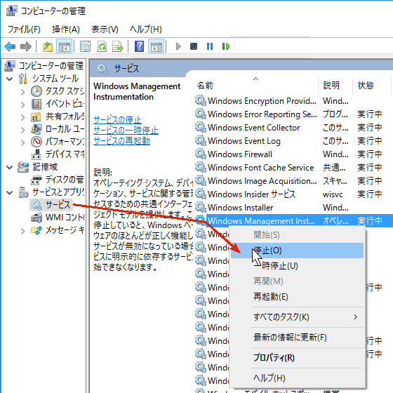 「Windows Management Instrumentation」を探し、サービスの一時停止をクリック。(間違えないように)