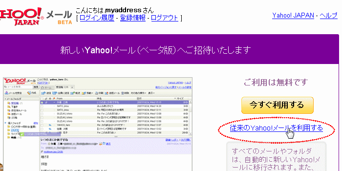 もし 下記のような画面が表示されたら「従来のYahoo!メールを利用する」をクリックします。(表示されなければ次の画面が表示される)